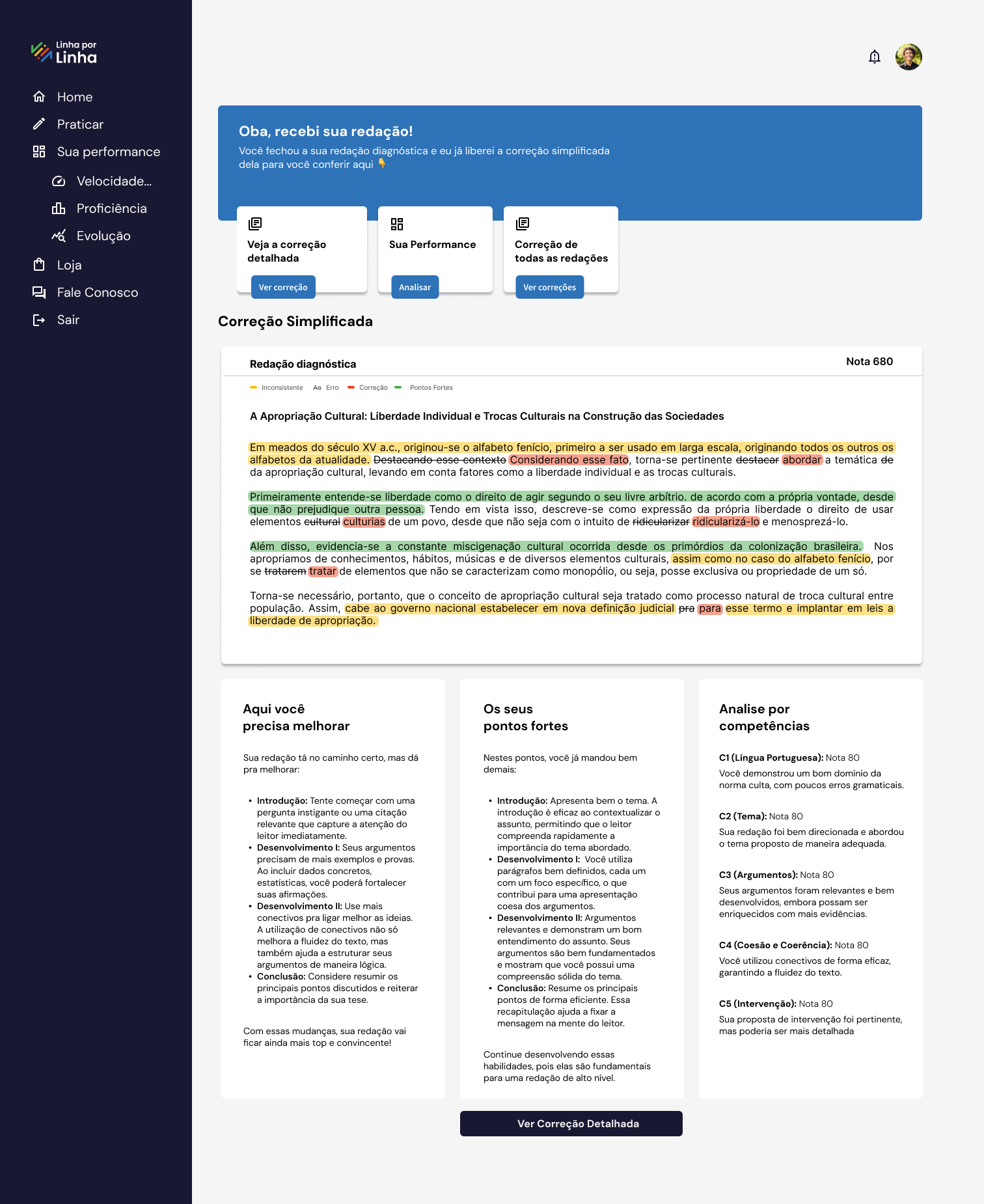Ao entrar na plataforma, você terá acesso a um ciclo de 4 redações + 1 relatório. Ao enviar sua redação para correção, você receberá instantaneamente o feedback dos pontos de melhoria, considerando os seguintes critérios: